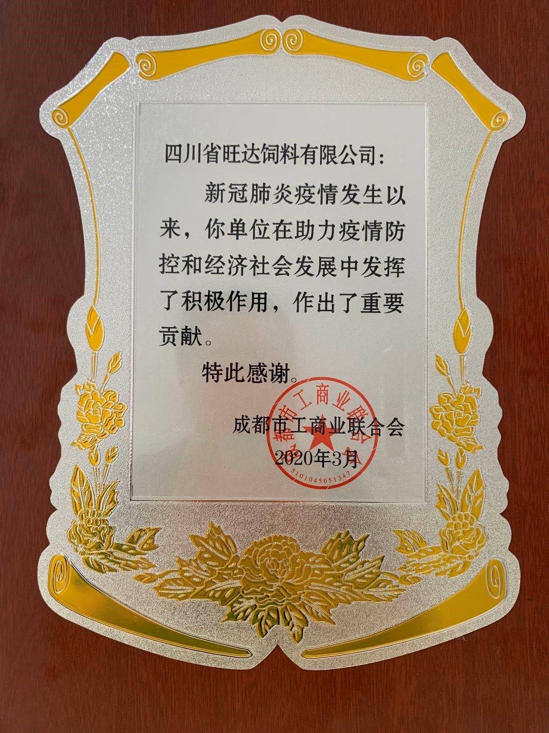 成都市工商聯(lián)授予四川旺達(dá)防疫優(yōu)秀企業(yè)