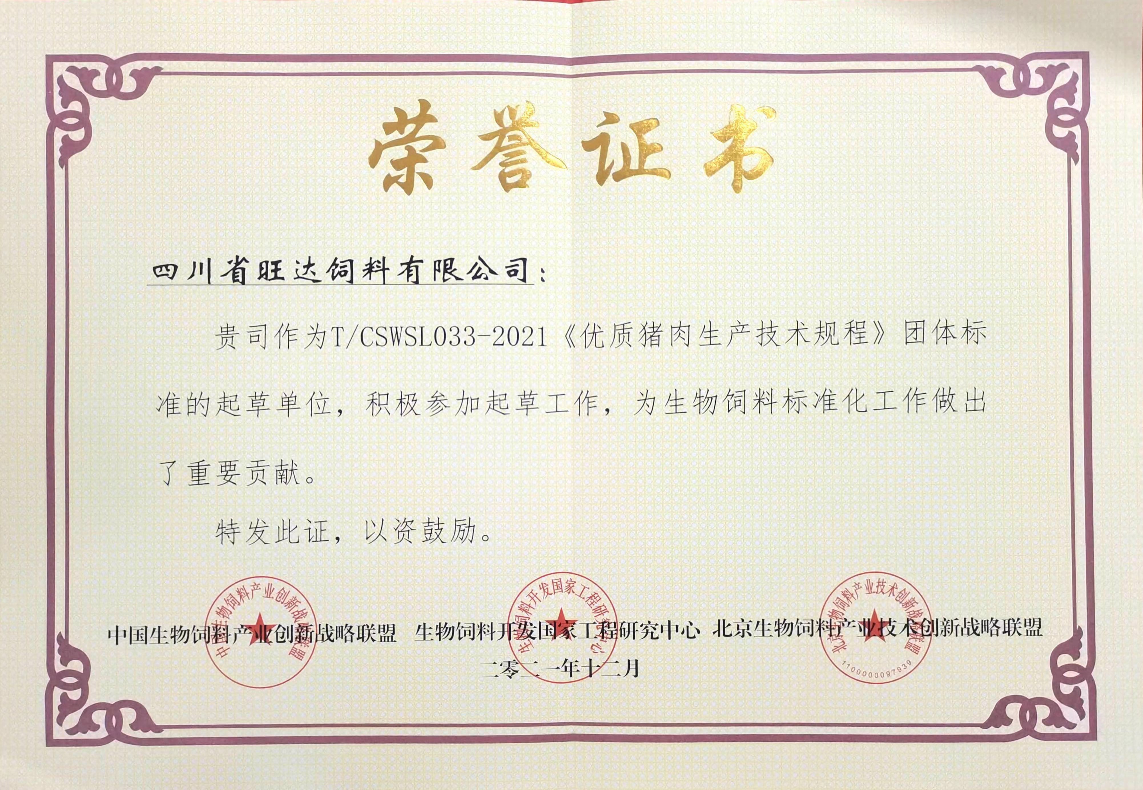 優(yōu)質豬肉生產技術規(guī)程團體標準起草單位證書
